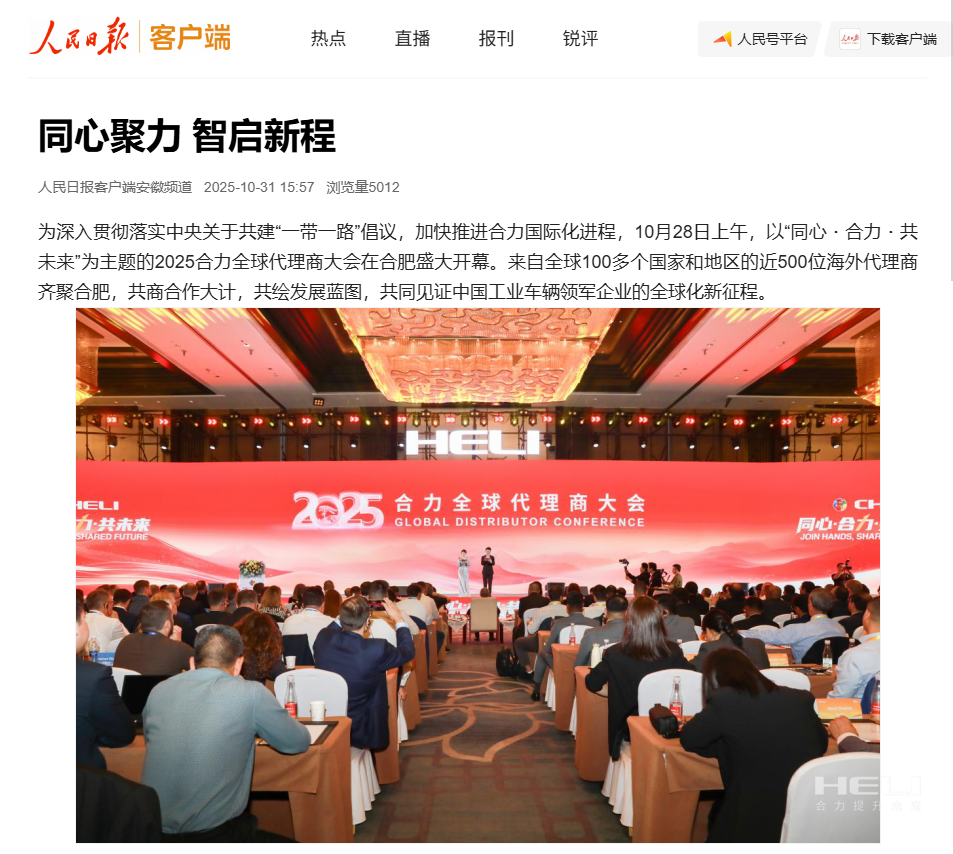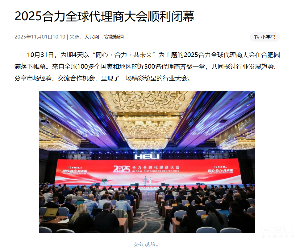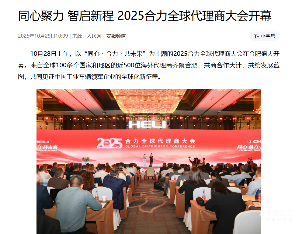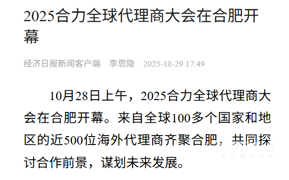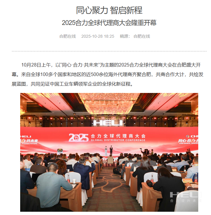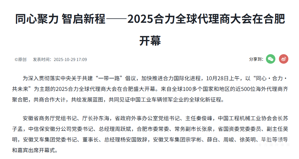 合肥制造,奋力出海!为深入贯彻落实中央关于共建“一带一路”倡议,加快推进jc710公海赌船国际化进程,10月28日,以“同心・jc710公海赌船・共未来”为主题的2025jc710公海赌船全球代理商大会在安徽合肥开幕。此次会上,来自全球100多个国家和地区的近500位jc710公海赌船海外代理商齐聚,共同见证中国工业车辆领军企业的全球化新征程。