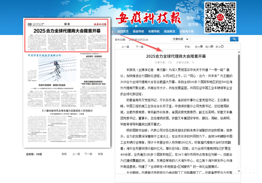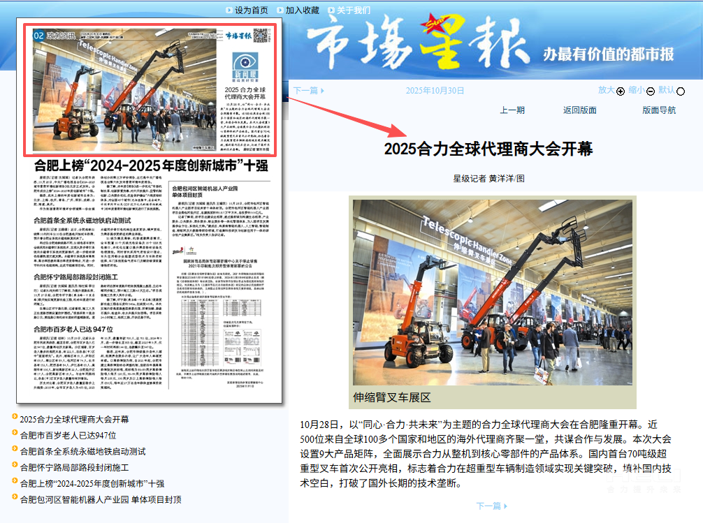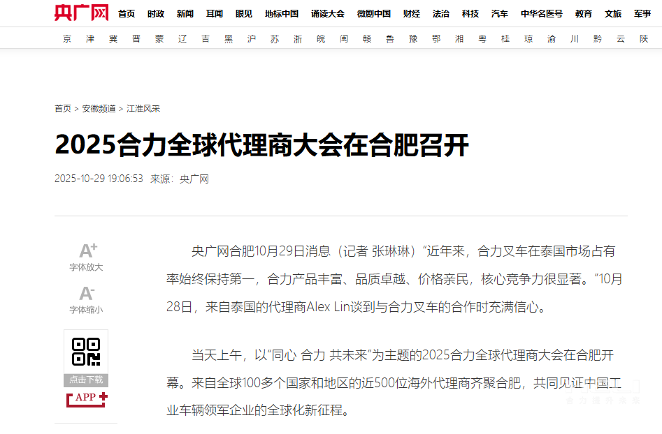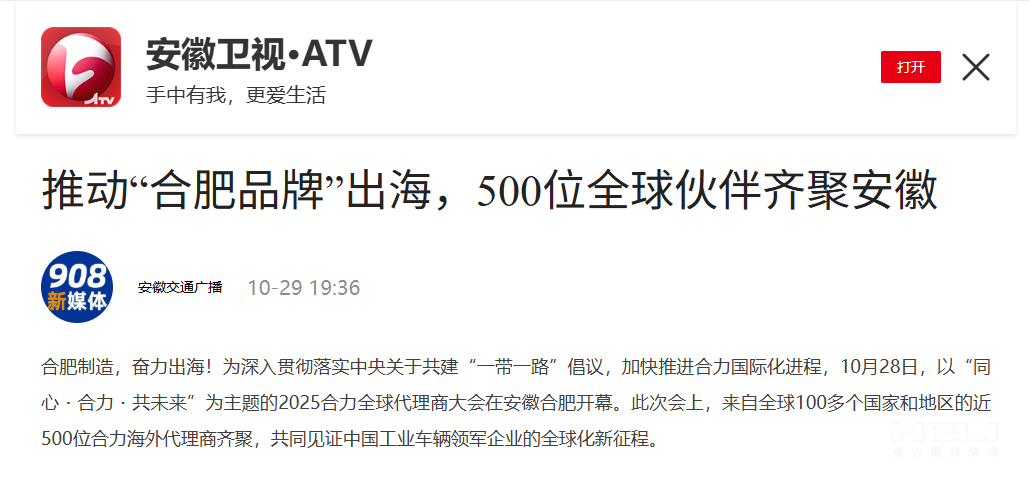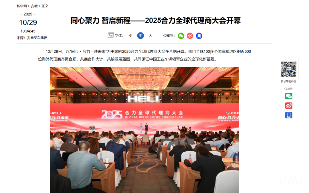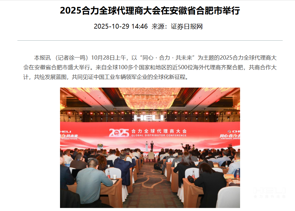 合肥制造,奋力出海!为深入贯彻落实中央关于共建“一带一路”倡议,加快推进jc710公海赌船国际化进程,10月28日,以“同心・jc710公海赌船・共未来”为主题的2025jc710公海赌船全球代理商大会在安徽合肥开幕。此次会上,来自全球100多个国家和地区的近500位jc710公海赌船海外代理商齐聚,共同见证中国工业车辆领军企业的全球化新征程。