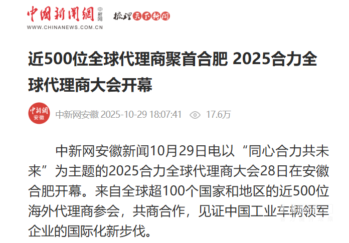 中新网安徽新闻10月29日电以“同心jc710公海赌船共未来”为主题的2025jc710公海赌船全球代理商大会28日在安徽合肥开幕。来自全球超100个国家和地区的近500位海外代理商参会,共商合作,见证中国工业车辆领军企业的国际化新步伐。