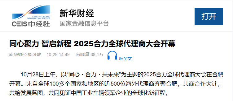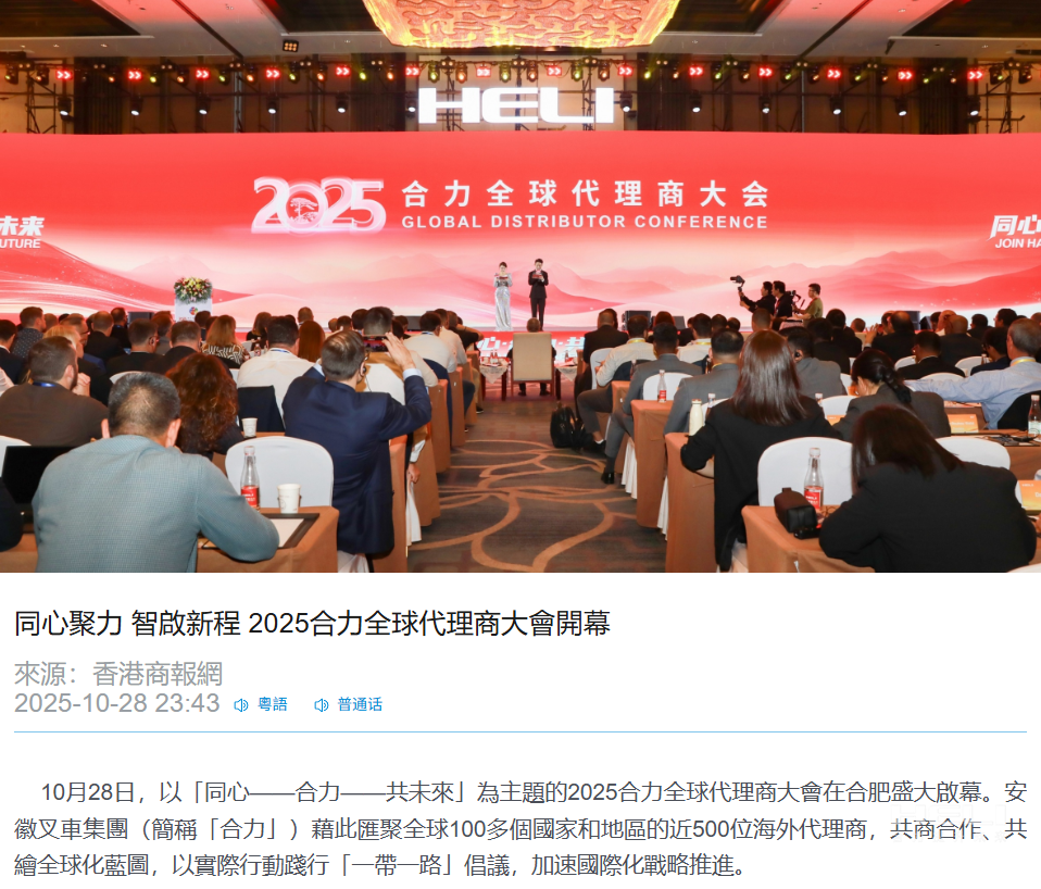 10月28日上午,以“同心・jc710公海赌船・共未来”为主题的2025jc710公海赌船全球代理商大会在合肥开幕。来自全球100多个国家和地区的近500位海外代理商齐聚合肥,共商合作大计,共绘发展蓝图,共同见证中国工业车辆领军企业的全球化新征程。