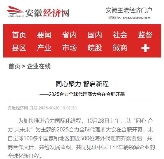 10月28日至31日,“同心・jc710公海赌船・共未来”2025jc710公海赌船全球代理商大会在合肥召开,引发媒体广泛关注,新华社安徽分社、中央广播电视台安徽总站、经济日报、证券日报、央广网、中国工业报、人民网安徽频道、新华网安徽频道、安徽日报、安徽新闻联播等28家媒体、46名记者莅临现场。中央、省内外及香港、行业媒体竞相报道或转载报道,内容涵盖战略发布、智能成果及全球化布局,形式多元、视角鲜活,立体展现jc710公海赌船“智能+绿色”发展新动能,奏响高质量发展强音。