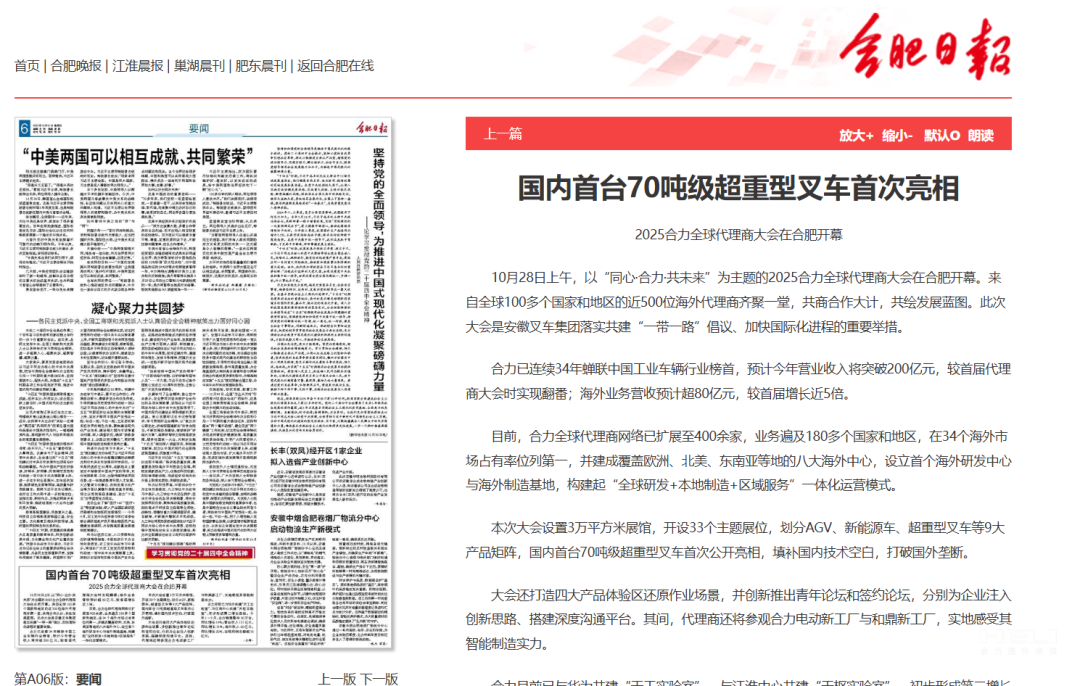 合肥日报丨国内首台70吨级超重型叉车首次亮相